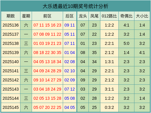 上期记忆:大乐透第2025145期:前区05、07、20、22、25;后区04、05,其中前区012路比为0:3:2,奇偶比为3:2,后区开出偶数号码04、05。