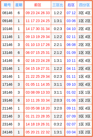 二区分析【13-24】:在积年大乐透第146期同时奖号中,该区开出率为38.75%,证据颠倒活跃。本期瞻望该区出号1枚,保举出号温雅:13。